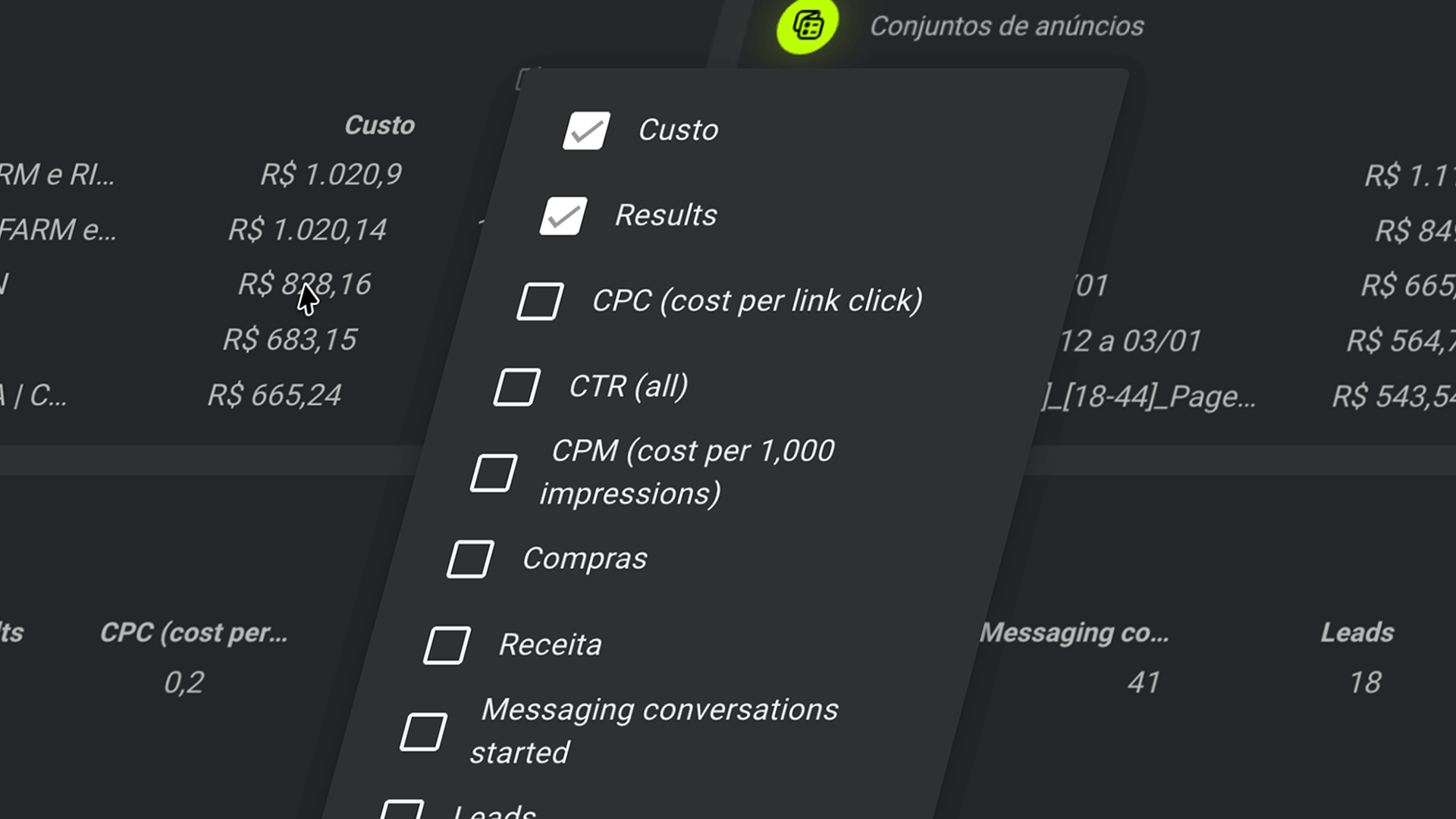 Identifique a origem das conversões por campanha, conjunto e anúncio, com leitura direta.